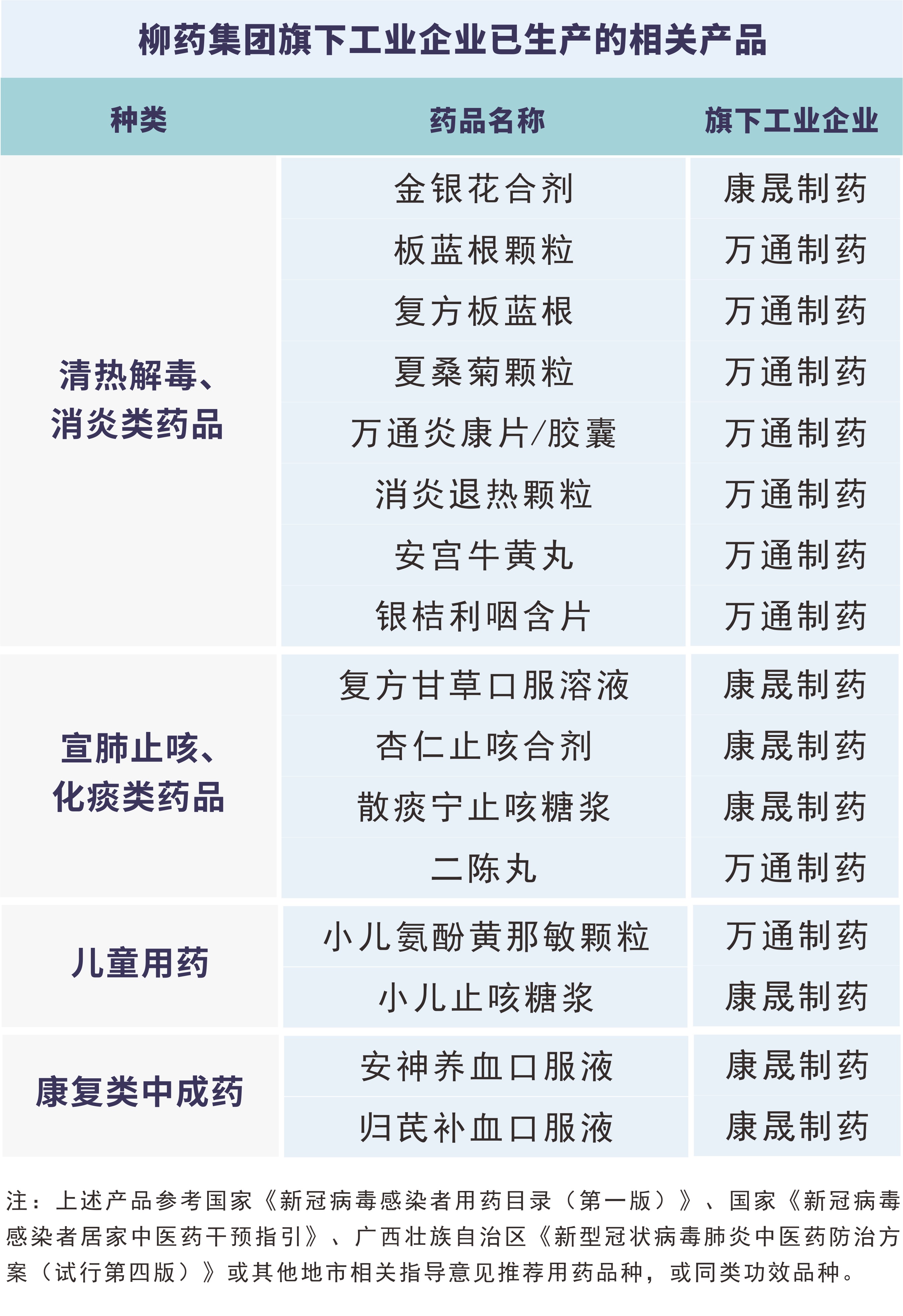集团旗下药品生产企业万通制药、康晟制药、仙茱中药科技等根据国家及地方治疗方案、推荐用药目录,加大集团旗下清热解毒、感冒用药、化痰止咳等相关产品及同类产品的生产力度,持续扩大产能。目前,相关产品的原材料采购储备充足,生产持续稳定,能够满足市场需求。